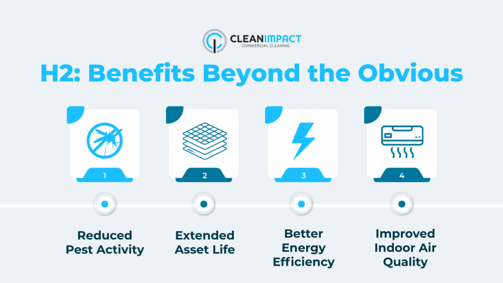 Think about your office right now. Dust accumulates on top of cabinets where nobody looks. Behind desks, forgotten food attracts pests. Under keyboards, bacteria multiplies unchecked. The air vents circulate dust and allergens throughout the building while everyone breathes them in day after day.