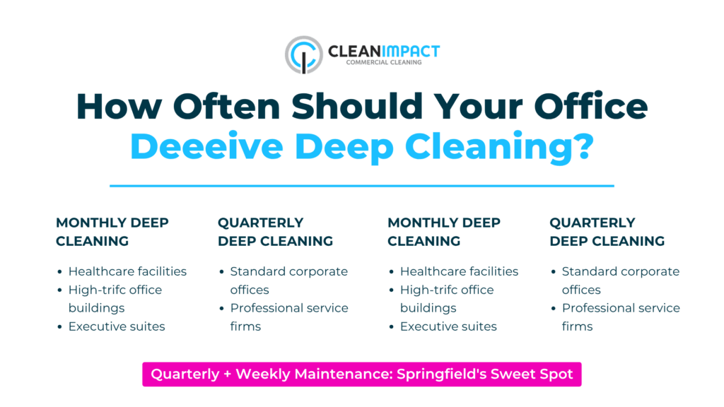 Most Springfield businesses find that quarterly deep cleaning combined with reliable weekly maintenance cleaning hits the sweet spot—maintaining cleanliness without excessive cost.
