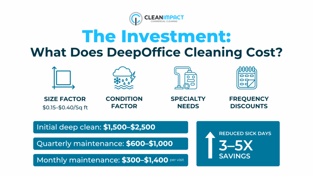 But here’s what matters—the ROI. Reduced employee sick days alone typically save 3-5 times the cleaning cost. Better client impressions and employee morale are bonuses.