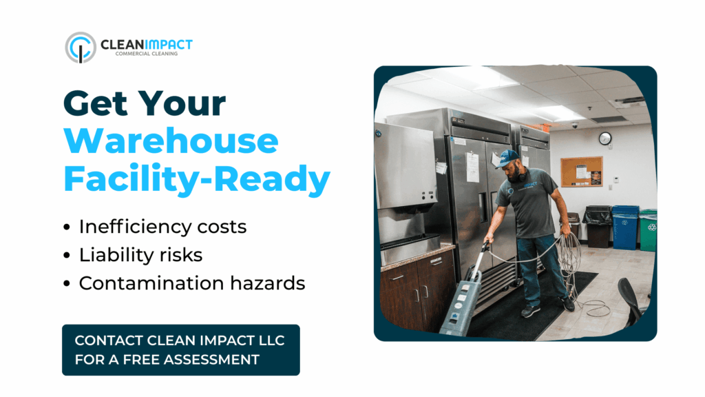 Contact Clean Impact LLC for a free industrial facility assessment. Let’s evaluate your warehouse environment and develop a customized industrial warehouse cleaning plan that protects your operations, your reputation, and your bottom line.